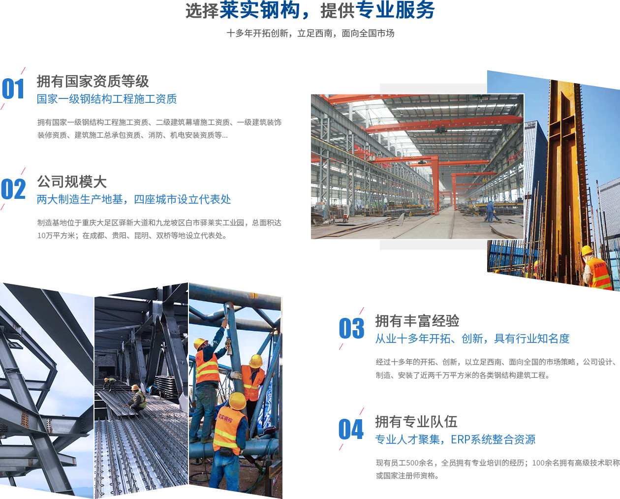 重慶萊實(shí)集團(tuán)——國(guó)家一級(jí)資質(zhì)企業(yè),是一家集建筑鋼結(jié)構(gòu)研發(fā)設(shè)計(jì)、鋼結(jié)構(gòu)制造、安裝于一體的大型鋼構(gòu)集團(tuán)公司。